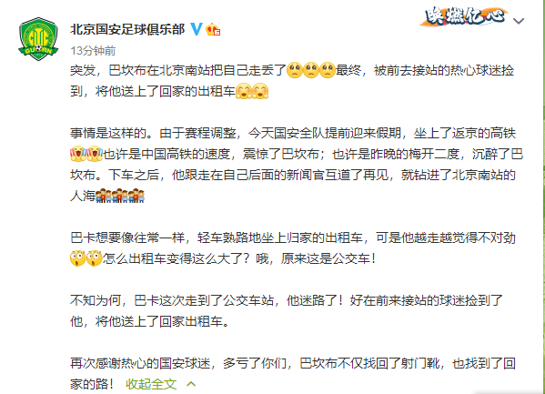 北京国安官方社交媒体发文称,巴坎布在北京南站把自己走丢了,被前去接站的热心球迷捡到,将他送上了回家的出租车。巴卡想要像往常一样,轻车熟路地坐上归家的出租车,可是他越走越觉得不对劲,不知为何,巴卡这次走到了公交车站,他迷路了!好在前来接站的球迷捡到了他,将他送上了回家出租车。