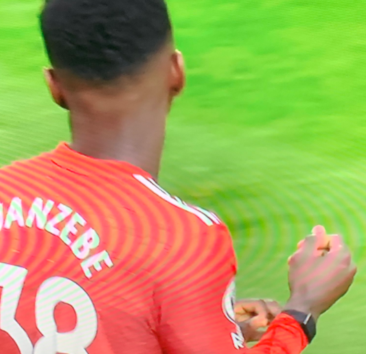 曼联1-2莱斯特城的赛后图片显示,曼联后卫图安泽贝在一次拼抢过程中露出了右手手腕,上面的黑色手环清晰可见: