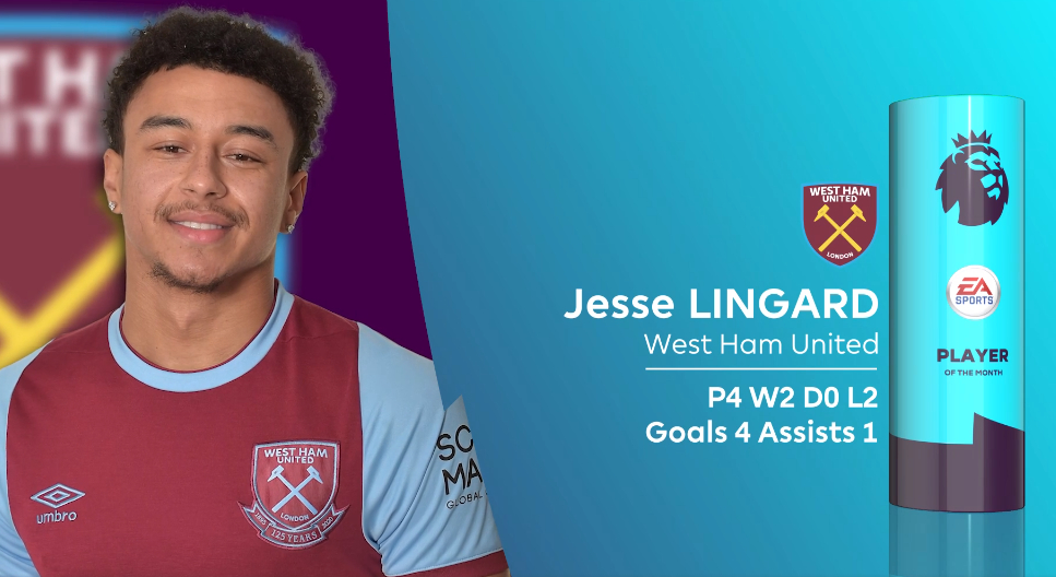 北京时间5月14日,英超官方宣布,从曼联租借至西汉姆联的“林皇”林加德当选了4月最佳球员。