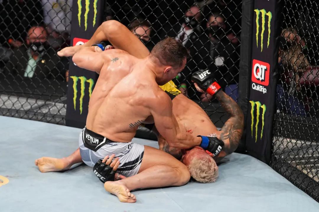 在轻量级豪取八连胜的奥利维拉,抓住了“小鹰”退役、“钻炮”约战这一连串历史机遇,幸运地登上了冠军赛场,而比赛的过程和结果,则完全与幸运无关。面对“钢铁迈克”钱德勒的开场猛攻,一度挨到重拳、踉跄后退的查尔斯,及时转换模式,将比赛拉入地面,虽然没能成功降服对手,但有效的减缓了比赛节奏,并成功消耗了对方的体力。而当经验丰富的钱德勒暴起逃脱,用大开大合的恐怖重拳全力反击时,奥利维拉这位“升级版夜魔”,则再次展现了足以媲美“夜师傅”的疯狂一面——面对将自己逼到笼边、几乎要实现重炮收割的“老钱”,查尔斯果断下潜,用近乎自杀的伏地摇闪,撑过了最危险的时刻,有惊无险地进入了第二回合。而当双拳抡得兴起的钱德勒,想在第二回合故技重施时,等待他的却是奥利维拉的果断前压和精准左勾……