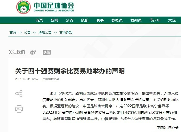 北京时间5月31日中午,中国足协官方发布消息称——由于对手阵中出现新冠病例而导致无法准时入境的原因,国足在世预赛40强赛中剩余阶段的比赛将不会在苏州举办,而是转移至阿联酋迪拜继续举行。