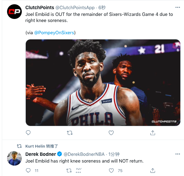 中场休息的时候,恩比德受伤的消息也传来了,他因为右膝盖酸痛,提前退出了比赛。