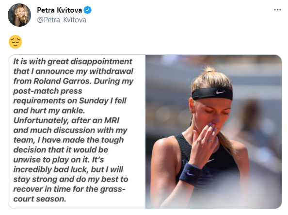 “我非常失望的宣布,我将退出本届法网争夺。我在首轮的赛后发布会上不慎弄伤了脚踝,在经过核磁共振检测并与团队成员讨论后,我做出了退赛的决定。对我来说,这非常不幸,但我会尽一切努力尽快恢复,为草地赛季做好准备。”科维托娃在退赛声明中说道。