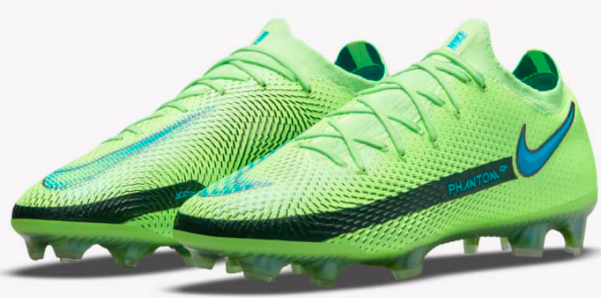 这一款NIKE PHANTOM GT 采用了一片式的Flyknit针织鞋面,同时鞋面上分布着类似磨砂颗粒的触控辅助设计,这是耐克的设计师们通过研究鞋面触球的角度、压力等一系列数据研发而成;并且这些触球颗粒是完全与Flyknit材质一体化而非直接覆于表面,从而保证了鞋面的柔韧性;球鞋整体的侧位鞋带非对称设计,也为球员提供了更加完整的触球区域。