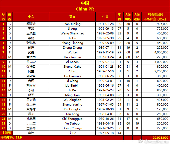 前锋:7-武磊、9-艾克森、11-阿兰、14-刘彬彬、17-吴兴涵、18-张玉宁、20-谭龙