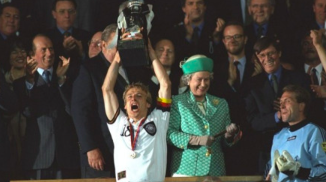 1996年的欧洲杯在英格兰举行,这也是决赛圈扩军为16支球队后的首次比赛。当届比赛德国队与捷克队会师决赛,常规时间内双方战成1-1平手。比赛进入加时赛,根据当时的金球赛制,先进球的一队将直接获得胜利;然而就在加时赛刚刚开始的第四分钟,比埃尔霍夫用一记力道十足的射门攻破了捷克队的城门,这也是欧锦赛历史上的第一粒金球。正如这一记突然而来的决胜金球,捷克队屈居亚军,而德国队也第三次问鼎欧洲之巅。