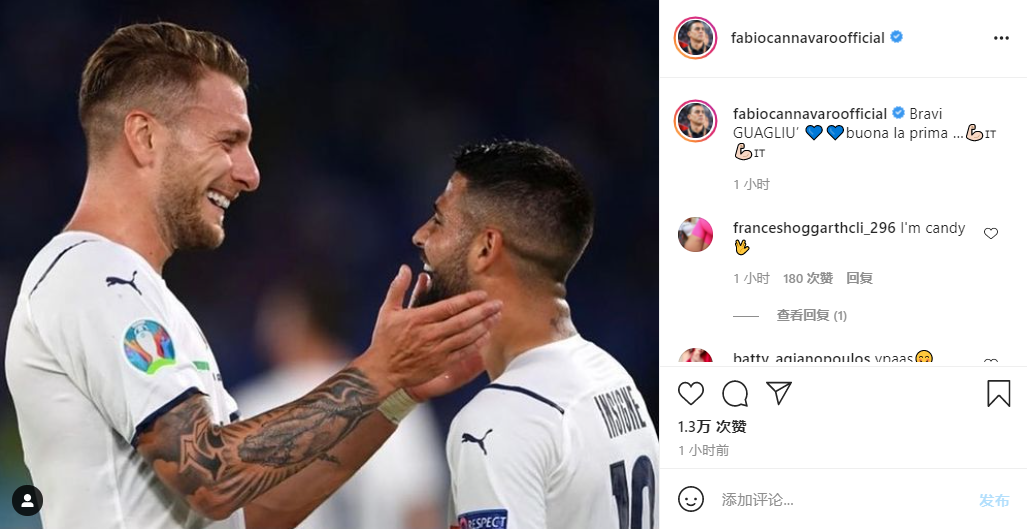 北京时间6月12日凌晨,欧洲杯揭幕战在意大利与土耳其之间展开,最终意大利3-0战胜对手取得欧洲杯开门红。赛后,现广州队主帅卡纳瓦罗在社交媒体上向意大利年轻的将士们表达了祝贺。