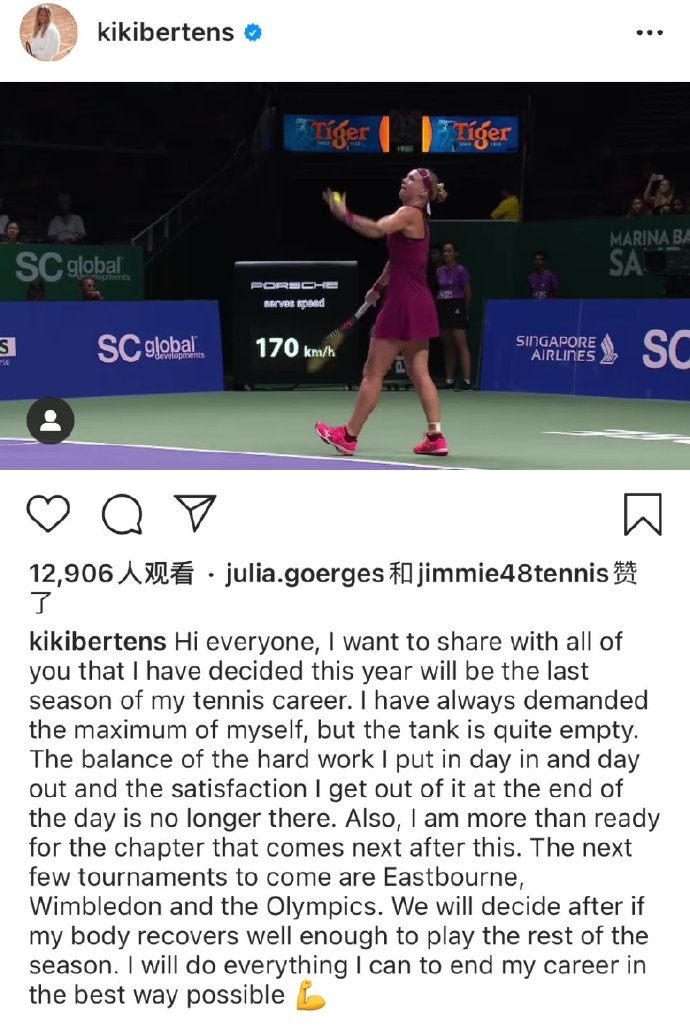 荷兰名将贝尔滕斯在个人社交媒体上宣布,将在今年结束网球生涯!