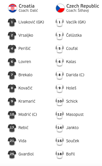 克罗地亚首发:1-利瓦科维奇、2-弗尔萨利科、6-洛夫伦、21-维达、25-格瓦尔迪奥尔、4-佩里西奇、8-科瓦契奇、10-莫德里奇、7-布雷卡洛、9-克拉马里奇、17-雷比奇