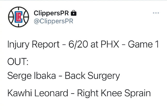 据快船官方消息,伦纳德因右膝扭伤缺席西决G1。
