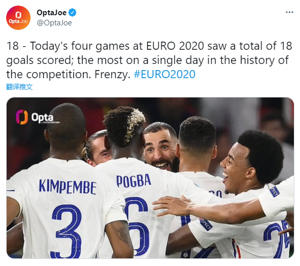 据Opta数据统计显示,今日4场比赛一共有18粒入球,是欧洲杯历史上进球最多的单个比赛日。