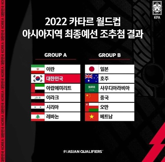 抽签结果与我们所期待的有很大不同。韩国与伊朗、阿联酋、伊拉克、叙利亚和黎巴嫩并列A组。为了踏上世界杯的舞台,韩国队要与强敌伊朗对决,而韩国队在两队过往的交战纪录中并不占优势。除此之外,阿联酋、伊拉克、叙利亚、黎巴嫩的客场都将是无比艰难的远征之路。