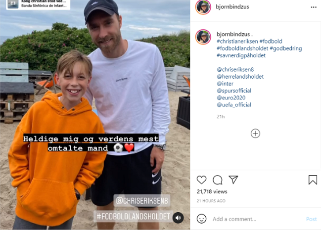 埃里克森出现意外后受到世界球迷的关注,在接受皮下心脏除颤器手术后,埃里克森和家人一起回到哥本哈根的家中,并开始了自己的度假。据天空体育报道,近日,埃里克森在丹麦北部的蒂斯维尔德耶海滩上度假,有一名11岁的丹麦小球迷Bjørn与他合影,并在自己的社交媒体上晒出这张照片,写道:“‘幸运的我’和‘世界上最受关注的人’”。
