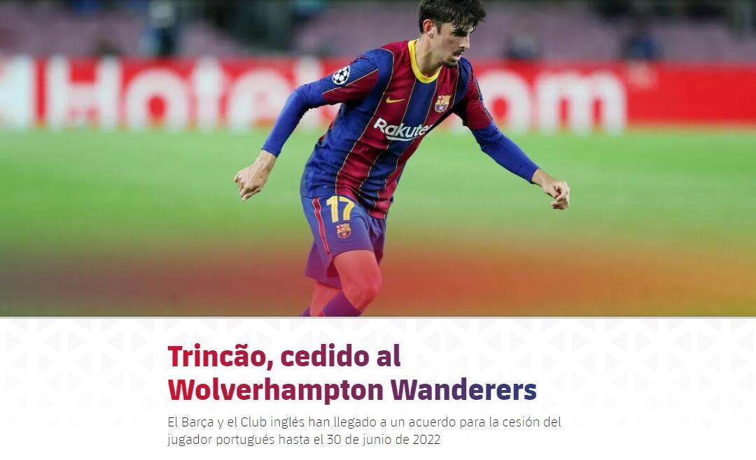 巴塞罗那足球俱乐部与伍尔弗汉普顿流浪者足球俱乐部达成协议,特林康将租借至伍尔弗汉普顿流浪者足球俱乐部直至21/22赛季结束。祝愿特林康在狼队一切顺利!