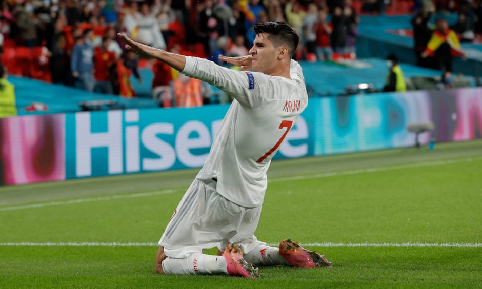 今天凌晨欧洲杯半决赛意大利vs西班牙,比赛进行到第80分钟,奥尔莫送出直塞,莫拉塔插上拿球杀入禁区,顺势推射破网,1-1!扳平比分的莫拉塔在底线旁肆意滑跪,双臂张弓搭箭,接受看台传来的山呼海啸……