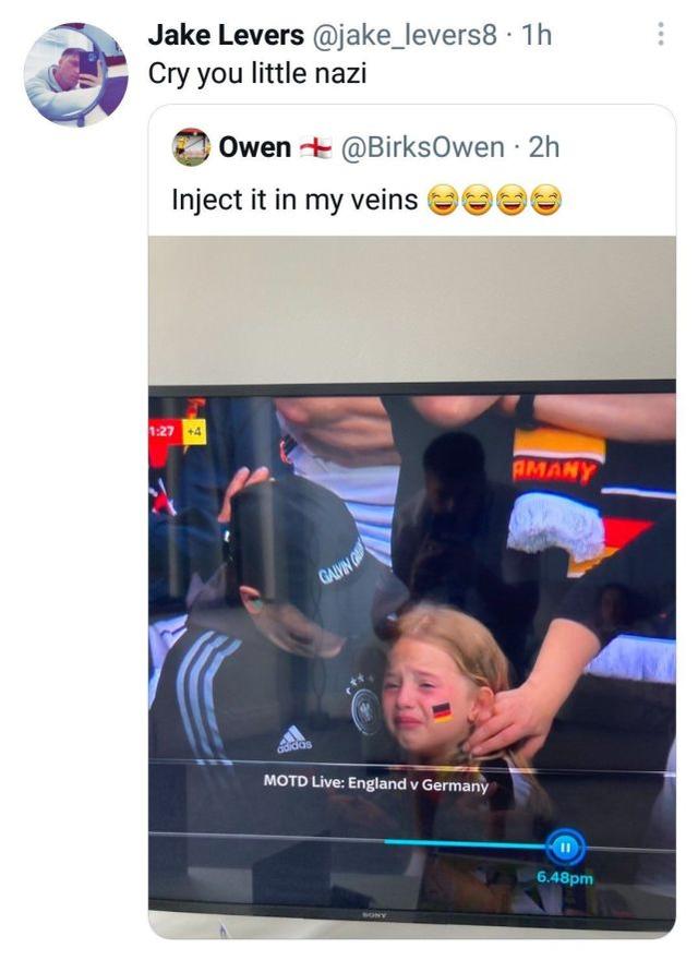 根据社交网站上的截图显示,许多英国球迷用极尽侮辱性的语言对这位哭泣的德国小球迷实施网络暴力,包括以“纳粹的渣滓”和其他侮辱性名词来称呼她。其中一位推特用户说:“哭吧,你这个小纳粹”,而一名叫做杰克·卡尔·迪恩 (Jack Carl Dean)的英国网红则写道:“在看到一个10岁的德国小女孩在人群中哭泣时,我听到了酒吧人群中爆发出的欢呼声,这是我这辈子为自己身为英国人而感到最自豪的事。”