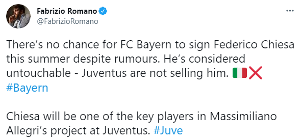 据意大利知名记者罗马诺的消息,尤文球员小基耶萨被视为非卖品,拜仁签不走他。