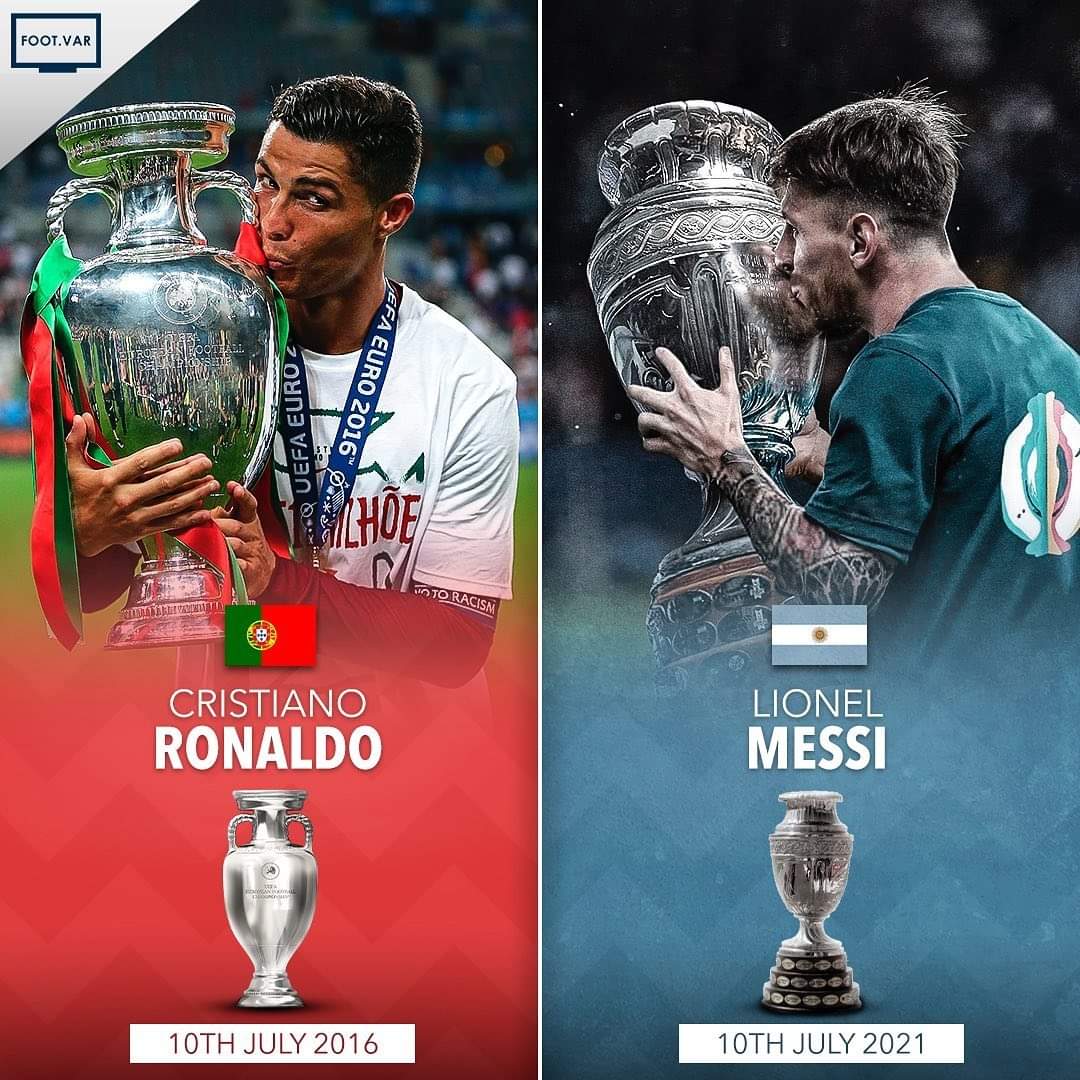 巧合的是,在2016年的7月11日,葡萄牙在欧洲杯决赛中通过加时赛战胜法国,夺得了冠军,那也是C罗的首个国家队世界大赛冠军。而两人的国家队大赛首冠也都出现在各自的洲际国家队大赛上。