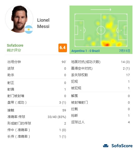 在今日结束的美洲杯决赛中,阿根廷1-0击败巴西夺冠。足坛巨星,阿根廷男足队长梅西却没有在这场决赛中踢出过多亮眼的表现。赛后,梅西在评分网站SofaScore的分数仅为6.4分,在队内排名倒数第二。
