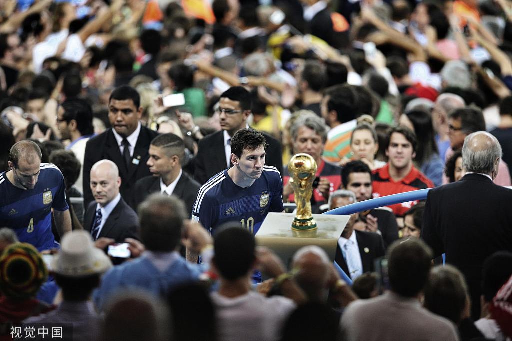 在无数光环下,梅西在2014年开启了又一次世界杯之旅。连续两届大赛没有进球让他备受质疑,于是他在3场小组赛便打入4球。淘汰赛连过瑞士、比利时,对阵荷兰再次鏖战至点球大战,梅西依然第一个站上点球点将球罚中,阿根廷涉险晋级。后面的故事我们都很熟悉了,梅西和伊瓜因都错失单刀,加时赛格策横空出世,一停、一射,打穿了阿根廷人的梦想。但谁记得阿根廷此前90分钟内赢下的比赛都只赢了一球。那支阿根廷众星云集不假,但从不敢说有高人一头的实力,如果没有梅西的4粒进球,他们可能小组赛一胜难求。相比对阵伊朗的补时绝杀,人们更熟知梅西决赛后痴望着大力神杯的镜头。