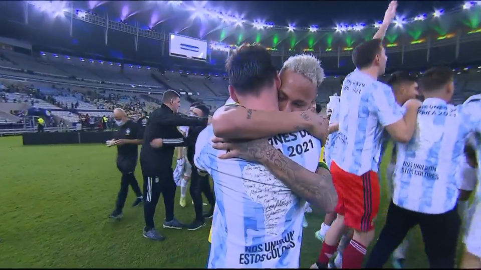 内马尔是一名喜怒哀乐都写在脸上的球员,而这位巴西球星显然对挚友夺冠一事由衷地感到开心,在赛后他被拍到与梅西谈笑的照片,这时的内马尔似乎已经走出了决赛失利的痛苦,而他大笑的画面出现在巴西国家队失利之后显然不合时宜。