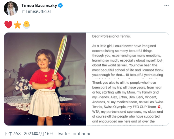 “感谢那些艰难的时光、欢笑、泪水,自我怀疑,还有我所学到的一切。感谢在我职业生涯中一直支持我的人们,家人、朋友、瑞士网协、瑞士奥组委,还有联合会杯的队友们。感谢你们对我的支持和鼓励,没有你们我拥有现在的成绩。”