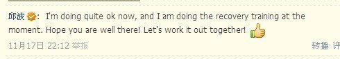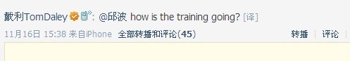 事实上,戴利与中国跳水运动员之间也发生了许多有趣的事情。伦敦奥运会前一年,戴利在微博上用英文向中国跳水运动员邱波问好,“@qiubo, How's training going?(邱波,最近训练情况如何?)”对此,邱波也在大家面前第一次使用英文向他回应道“I'm doing quite ok now, and I am doing the recovery training at the moment. Hope you are well there! Let's work it out together! (我现在的情况不错,正在进行恢复训练。希望你一切也好,大家一起加油吧!)”