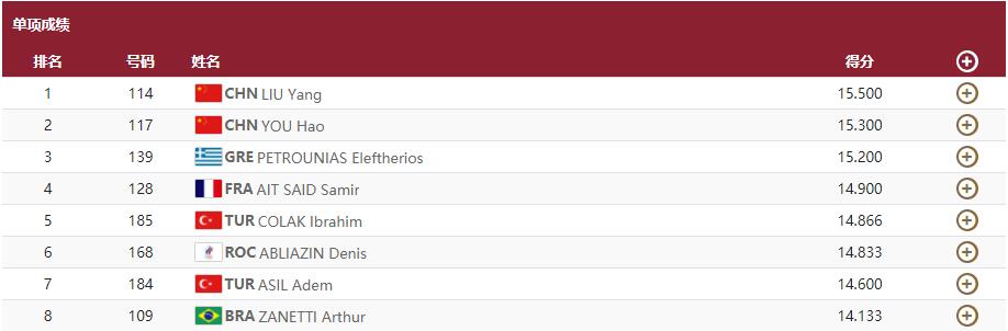 紧随其后排在第三出赛的是预赛排名第二的刘洋。他的全套动作难度分6.5,完成分15.500。二人暂时排在已经出场的三位选手中的前两位!