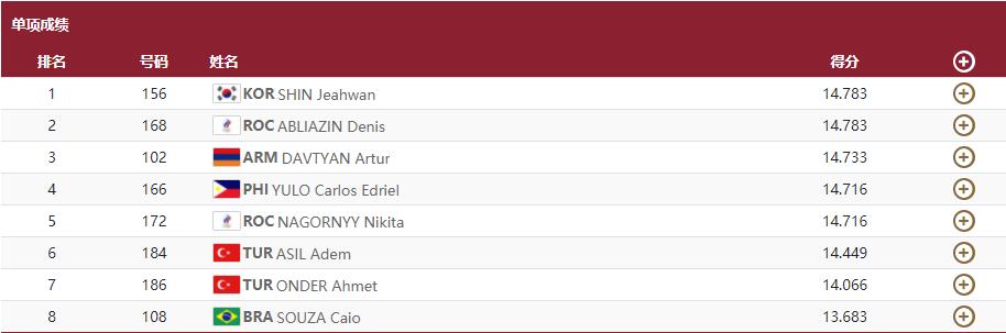北京时间8月2日,2020东京奥运会进入第九正式比赛日的争夺。竞技体操结束了男女多项决赛的争夺。男子跳马决赛,韩国选手申在焕第一跳获得14.733分(难度6.0、完成分8.833)、第二跳获得14.833分(难度5.6、完成分9.233)两跳总得分14.783斩获金牌!俄罗斯奥委会选手丹尼斯总分与申在焕同分(第一跳难度分5.6、完成分9.166总分14.766;第二跳难度5.6、完成分9.200、总分14.800),但是由于难度不及对手遗憾屈居亚军!亚美尼亚选手达夫提安以总分14.733获得铜牌!