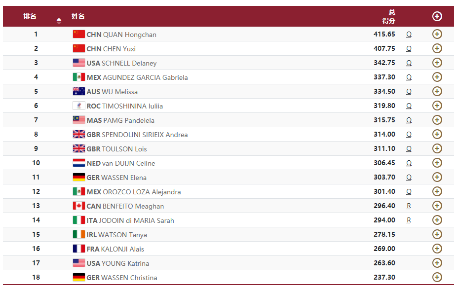 陈芋汐的最后一跳和队友选择一样的难度,同样以完美的收官得到86.40分,总成绩以407.75的分数排名第二晋级决赛。