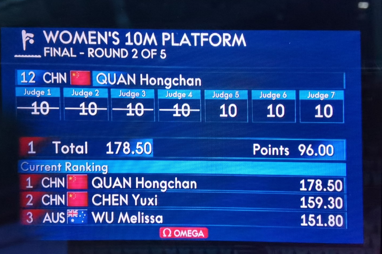 全红婵第二跳上场!选择407C的动作!凭借这一完美的跳跃,现场裁判狂飙7个10分,最终得到了96分!超越队友以178.50分排名第一。