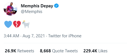 梅西的离队让德佩也感到极度失望,他在多个个人社交媒体都更新了状态,但没有使用文字,只简单地发了三个表情:代表巴萨配色的蓝色的心和红色破碎的心,以及代表梅西的山羊表情(以为史上最佳)。