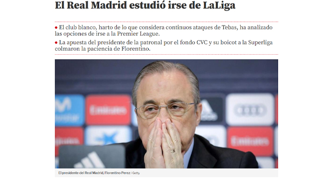 弗洛伦蒂诺为首的高层对于特巴斯近来持续针对皇马的行为感到十分不满,认为这位西甲联盟主席不断给给他们制造各种麻烦和障碍,在这样的情况下,他们如果退出西甲,那么首选是加入英超联赛。不过英超并不是唯一选项,他们也考虑了加入意甲和德甲的可能,并且也收集了相关信息。