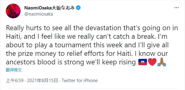 震后,不少社会知名人士第一时间向海地灾区发去慰问,并在社交网站上为受灾者祈愿祝福,父亲是生于海地美国人的混血网球名将大坂直美也是其中之一。这位现WTA世界第二在社交媒体上发文祈愿的同时表示她会将下周参加辛辛那提站所获奖金捐赠出用于海地的震后救灾工作!