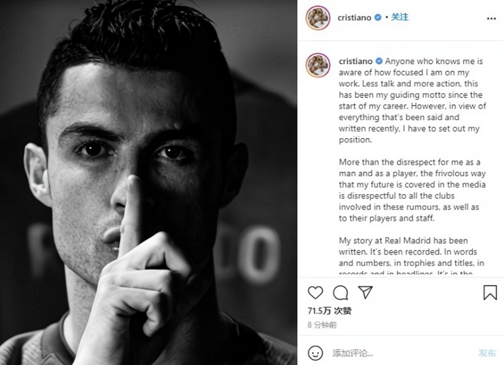 ▍C罗社媒亲自辟谣转会:媒体的报道是对我和涉及球队的不尊重