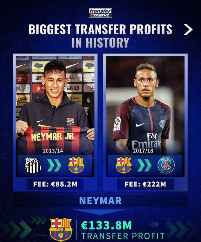 1、巴萨——内马尔:转入8820万欧,转出2.22亿欧,获利1.338亿欧