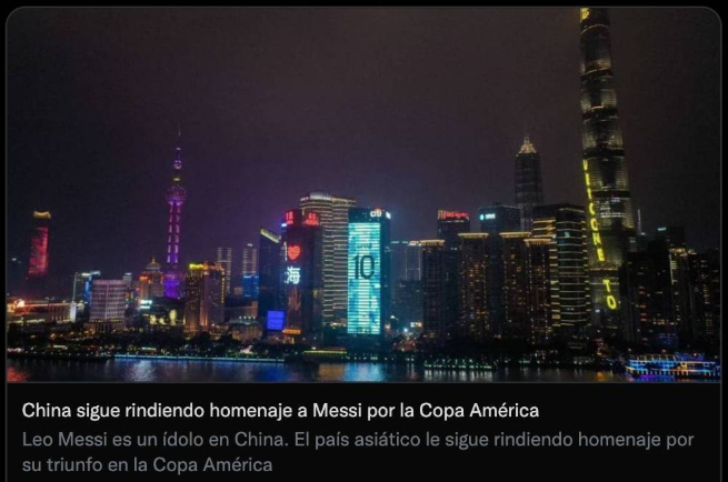 一个月前,国内某知名体育平台上有一位名叫“瓜大王为兑现七年前的承诺”的女球迷曾表示,如果梅西能够率领阿根廷问鼎美洲杯冠军,他就将包下上海外滩C位的大屏幕并筹备一场十分钟的无人机表演来为其庆祝。在梅西最终率队击败巴西、夺得国家队生涯首次正式大赛冠军后,这位球迷决定不惜花费重金来兑现自己的诺言——虽然由于七月的禁飞令导致这项计划被迫延期至八月、最终无人机表演也由于种种客观因素限制未能施行,但在北京时间8月21日晚间,人们终于还是在外滩的大屏幕上见证到了一场属于梅西的灯光秀。