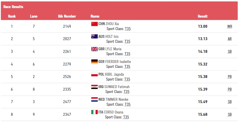 北京时间8月27日,2020东京残奥会第三比赛日,女子100米T35决赛,周霞以13秒00的成绩打破世界纪录,夺得该项目金牌!