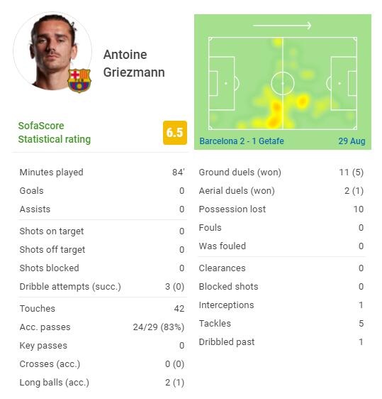 在巴萨2-1小胜赫塔菲的比赛当中,首发出战的格列兹曼再次踢出了一场糟糕的比赛,多项关键数据挂零。