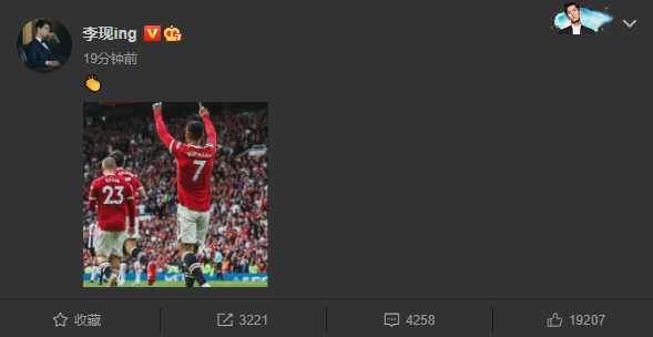 北京时间9月11日晚间结束的一场英超联赛第4轮中,曼联坐镇主场4-1大胜纽卡斯尔联暂时登上了积分榜首位,本场比赛重返曼联后首发出战上演回归处子秀的C罗上演梅开二度成为了球队获胜的首功之臣,他也在赛后毫无悬念地被英超官方评选为了本场的最佳球员。赛后,国内著名演员李现也在个人微博上发布了一张C罗的庆祝图片并配上了鼓掌的表情,以此来表达对其王者归来的祝贺。