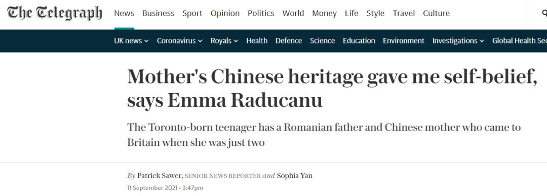《每日电讯报》还打出大标题:《艾玛·拉杜卡努说:母亲的中国传统给了我自信》。