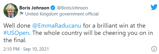 首相约翰逊在半决赛后发推:“祝贺@EmmaRaducau在美国公开赛获得伟大胜利。决赛的时候整个国家都会为你加油打气。”