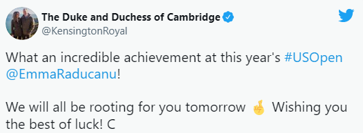 凯特王妃是草地网球俱乐部的赞助人和网球粉丝,她在美网决赛前兴奋地表示,拉杜卡努的成就“无与伦比”,还祝她好运。