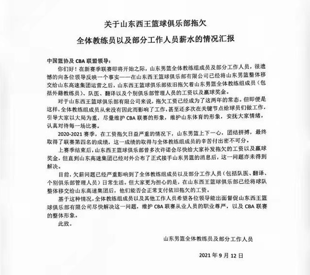 今天,媒体人半神半卡特在社媒上分享了一封署名为山东队全体教练组成员及部分工作人员的信件,表示山东西王仍拖欠教练组、队医等工作人员的工资。