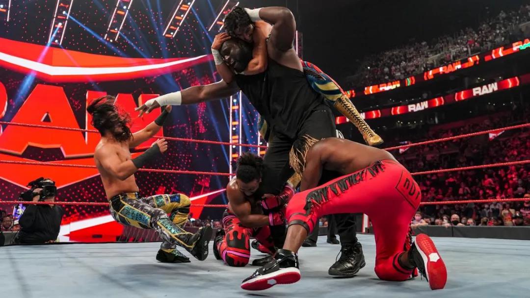 四对双打组合两两搭配,展开了一场四对四团战,分别由新希望和穆斯塔法-阿里&曼苏尔对阵AJ斯泰尔斯&奥莫斯和狼牙&铁棒。