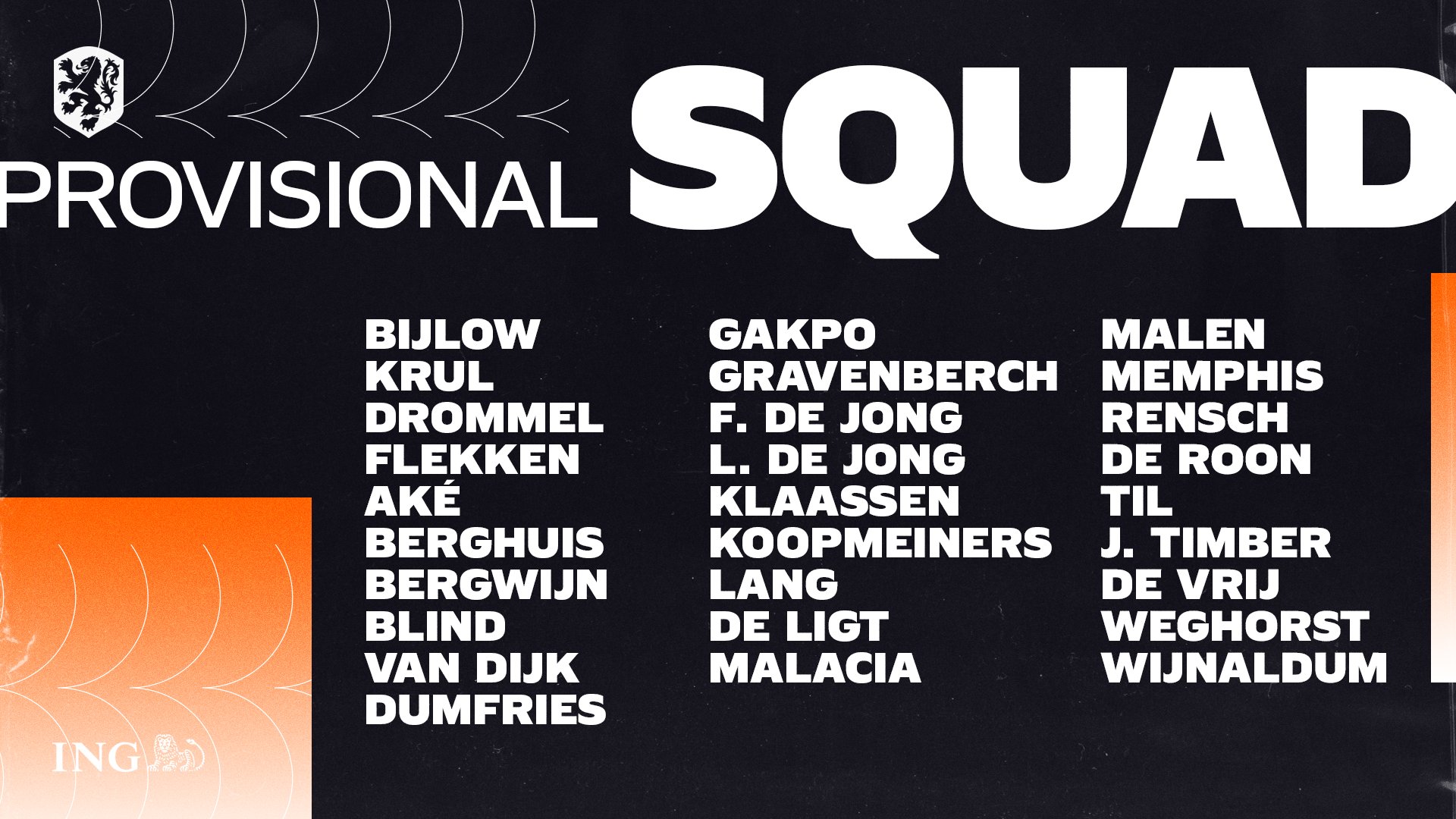 10月份国家队比赛日,荷兰队将世界杯欧洲区预选赛中对阵拉脱维亚与直布罗陀,今日,球队公布了28人的预选名单。