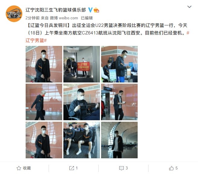 北京时间9月18日,根据辽媒官方消息,出征全运会U22男篮决赛阶段比赛的辽宁男篮一行,今天(18日)上午乘坐南方航空CZ6413航班从沈阳飞往西安,目前他们已经登机。