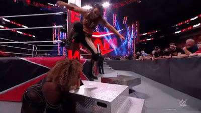 就在这之后,乱了节奏的AJ先吃到一发边绳DDT,随后便倒在了RKO之中。