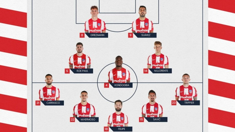 马竞首发:13-奥布拉克、22-埃尔莫索、18-费利佩、15-萨维奇、21-卡拉斯科、23-特里皮尔、4-孔多比亚、5-德保罗、14-马科斯-略伦特、8-格列兹曼、9-苏亚雷斯