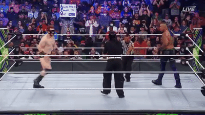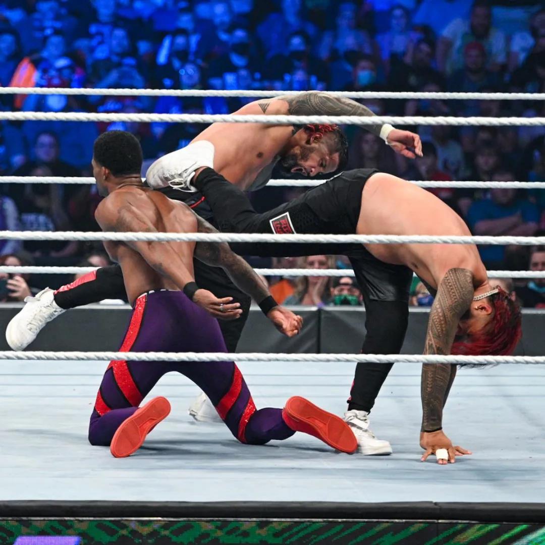 六人随即被安排进一场三对三大战中,在伍兹和科菲先后损耗了全能王的战斗力,并且抗住了奥莫斯的乱拳后,大E在关键时刻回血重返战局,而全能王和传奇大师则因没有默契屡屡引发摩擦,最终大E躲避了莱斯利的飞冲肩,致使AJ成为了受害者,大E则顺势对莱斯利使出大终结,力挽狂澜拿下胜利。